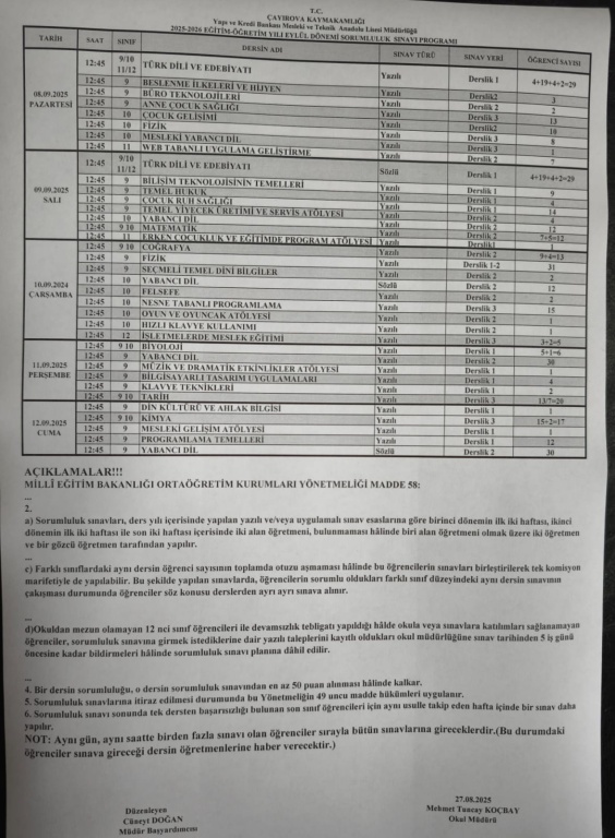 2025-2026 Eğitim Öğretim Yılı Eylül Ayı Sorumluluk Sınav Programı aşağıda paylaşılmıştır, öğrencilerimizin bilgisine.
